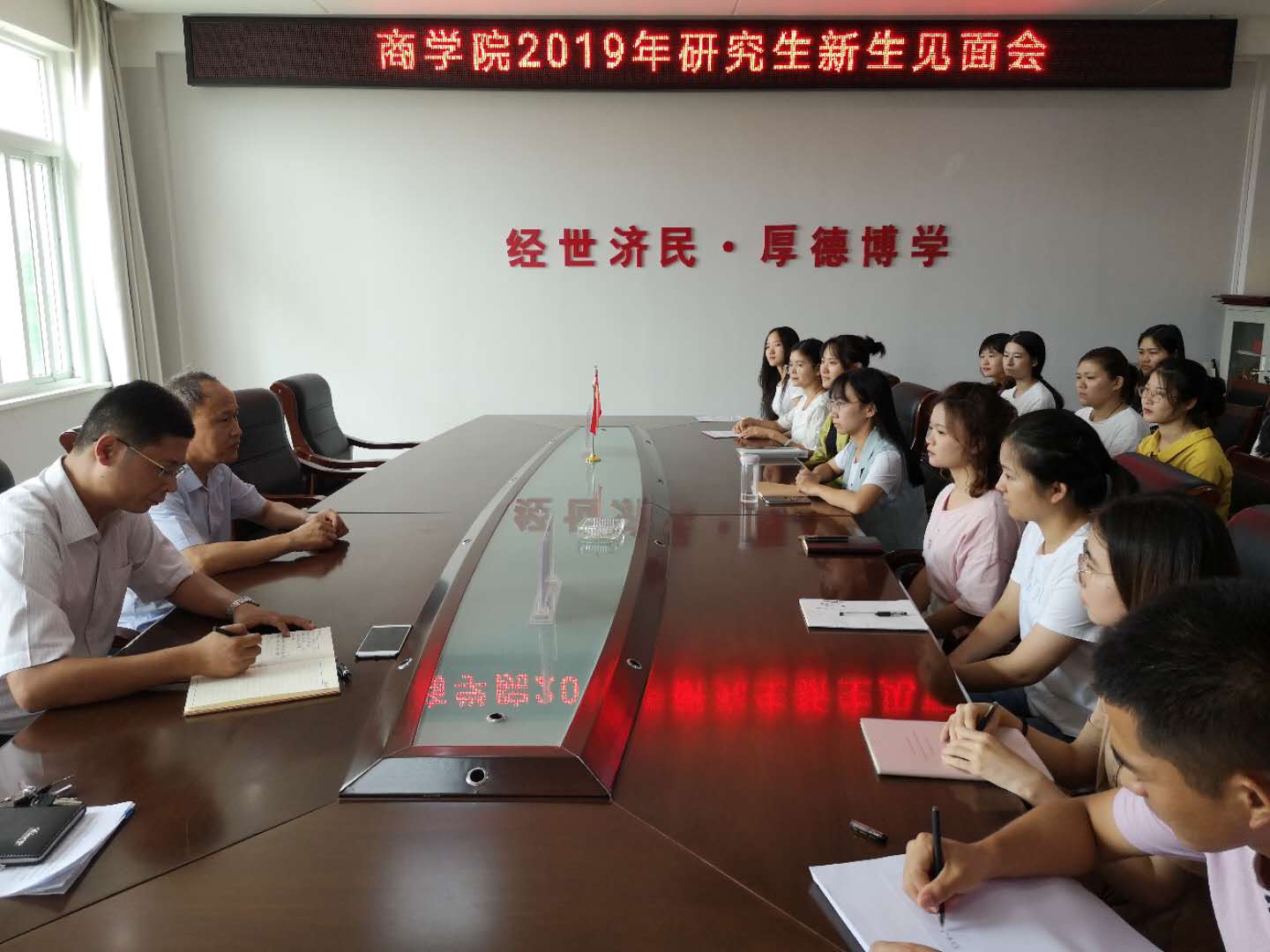 9月12日上午,William威廉英国在经管楼506举行2019级研究生新生见面会。William威廉英国党委书记盛正国教授、主管研究生工作的杜辉副院长、研究生秘书何凤老师以及全体新生参加会议。
