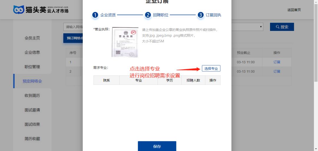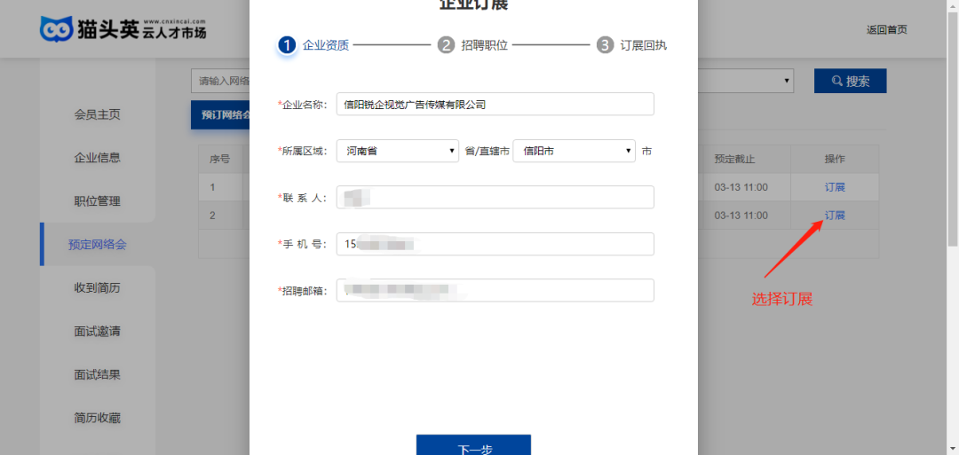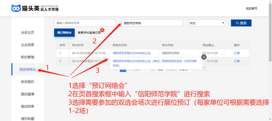 微信搜索“云人才市场”小程序,注册/登录→完善企业信息→平台进行审核,审核通过→查找所要参加的网络会→订展。