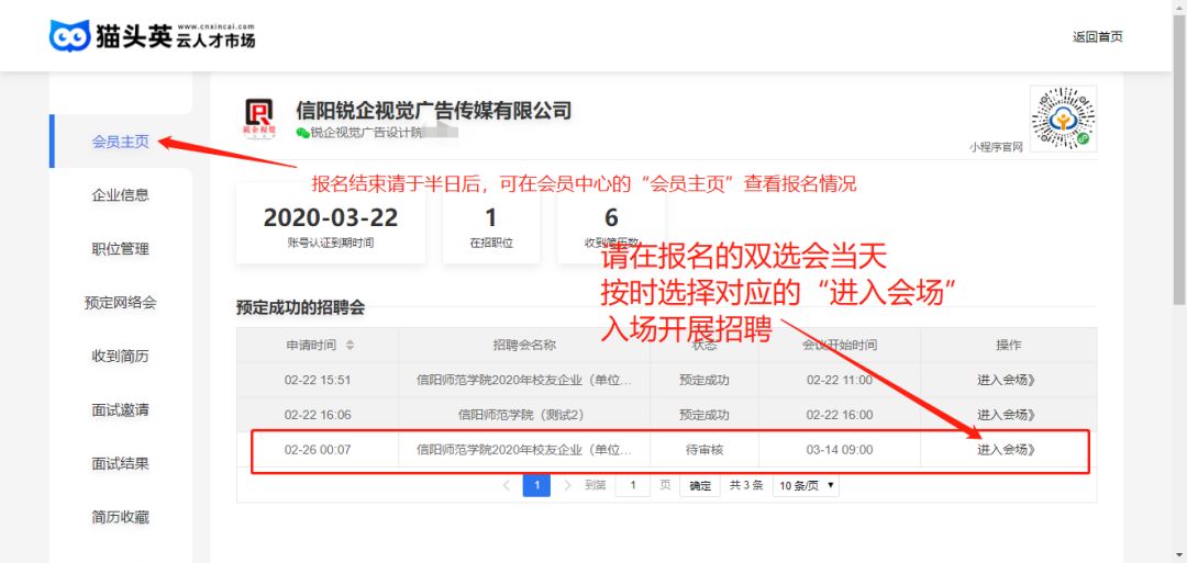 双选会当天进入双选会会场或点击参会网址http://hnxysf.cnxincai.com→企业登录→求职大厅→选择求职者,并点击该求职者下方的沟通→选择岗位→进行视频面试。视频挂断后,企业给出面试结果。企业可前往会员中心,查看收到的简历、面试结果。