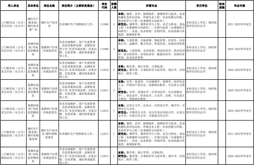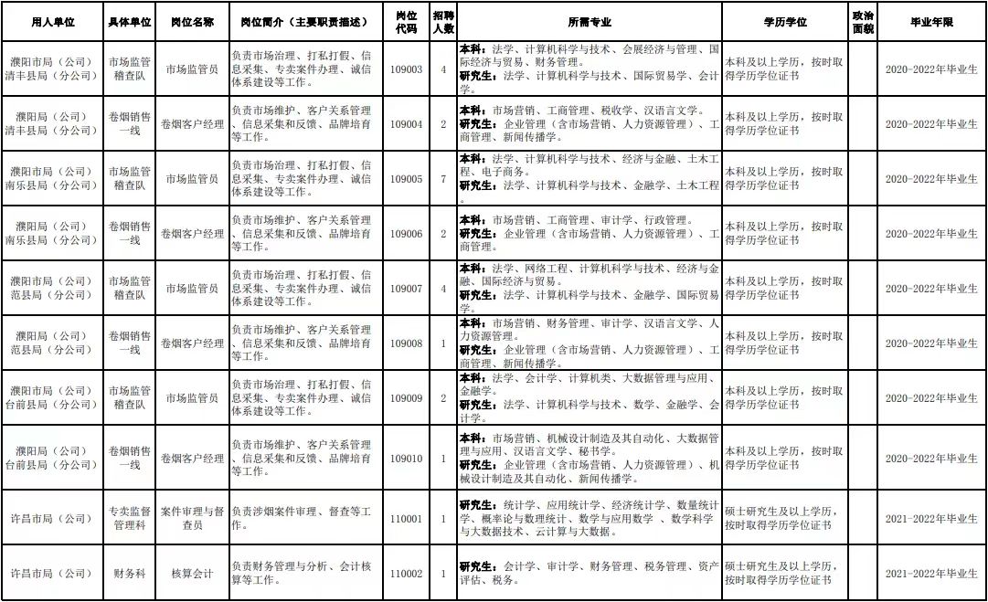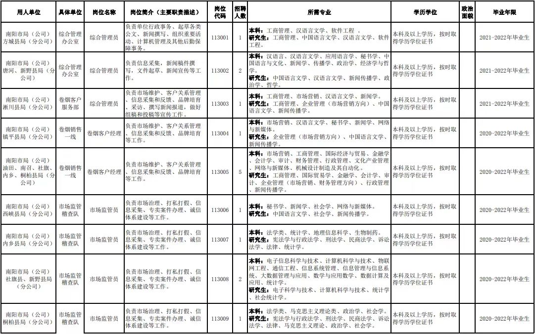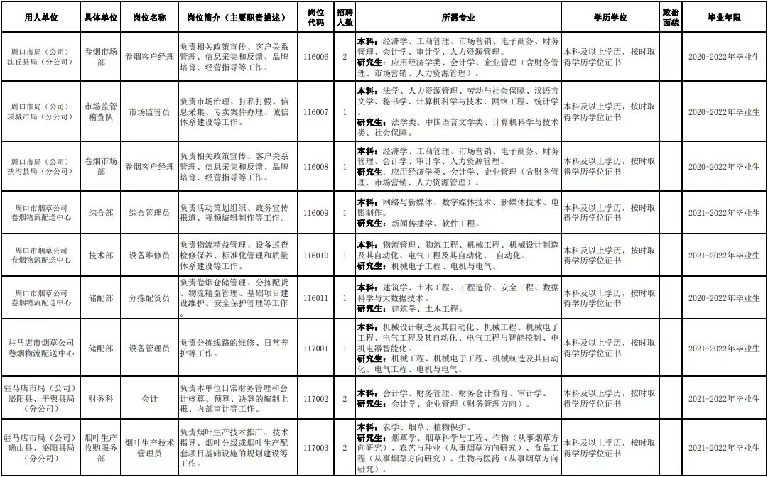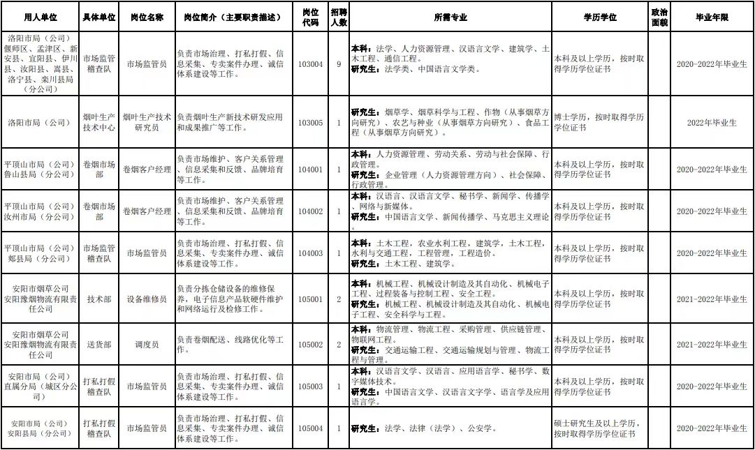 附件1.河南省烟草专卖局(公司)2022年高校毕业生招聘岗位明细表
