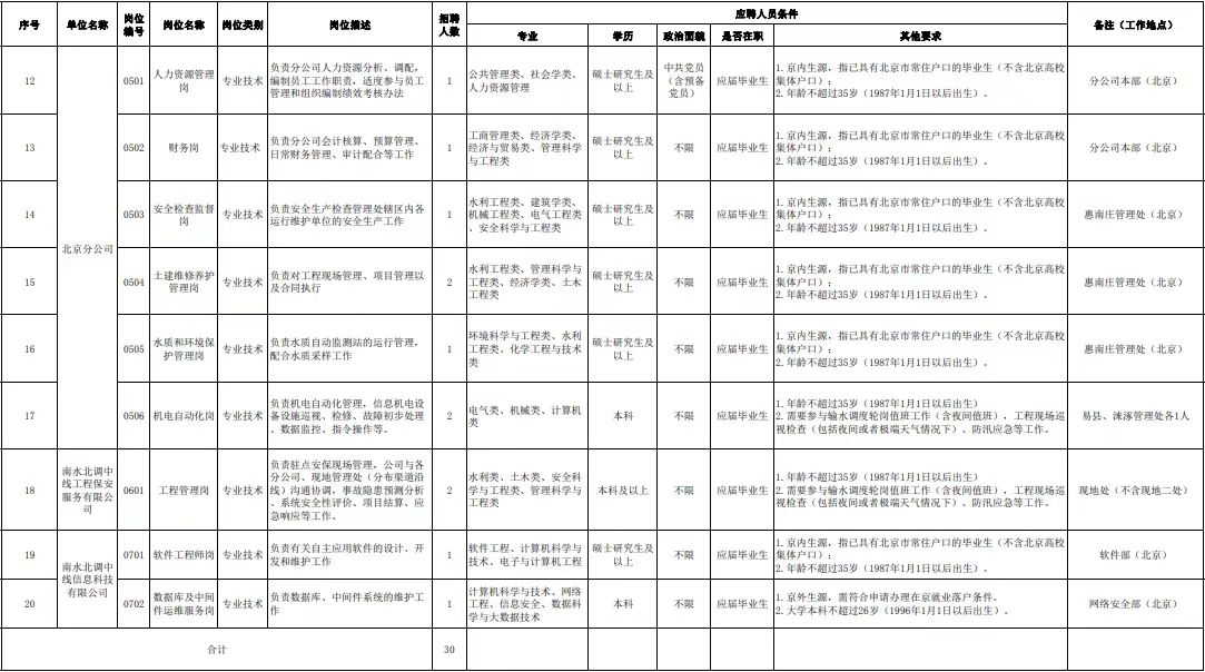 根据工作需要,中国南水北调集团中线有限公司公开招聘工作人员30名。现将有关事项公告如下: