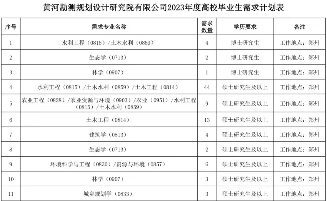 招聘计划和学历要求见《黄河勘测规划设计研究院有限公司2023年度高校毕业生需求计划表》。