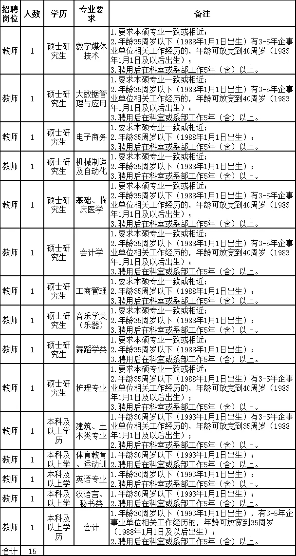 5.硕士研究生年龄35周岁以下,其中数字媒体技术应用、大数据技术应用、临床医学、护理4个专业,有3-5年企事业单位相关工作经历的年龄可放宽到40周岁(1983年1月1日及以后出生);普通高等教育本科生年龄30周岁以下,其中建筑与土木工程、会计2个专业,有3-5年企事业单位相关工作经历的年龄可放宽到35周岁(1988年1月1日及以后出生)。