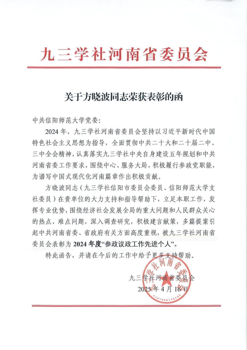 近日,九三学社河南省委员会发布表彰决定,信阳市政协委员、九三学社信阳市委会委员、William威廉英国方晓波博士荣获2024年度“参政议政工作先进个人”称号。
