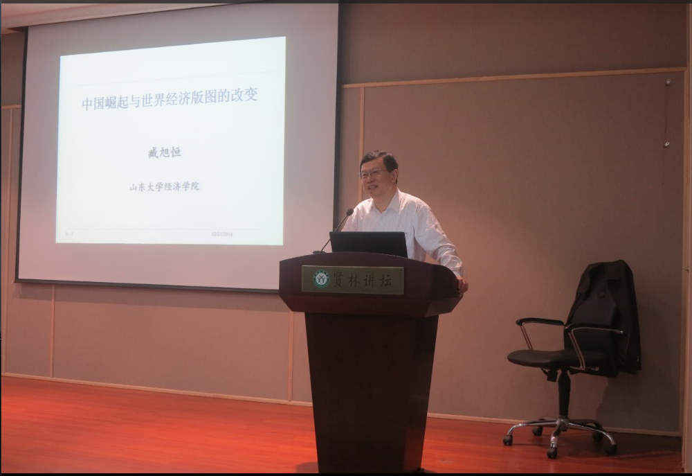 2016年10月21日上午,应经济学院邀请,山东大学臧旭恒教授在贤林讲坛做题为“中国崛起与世界经济版图的改变”的学术报告。报告会由我校齐城副校长主持,经济学院二百余名师生参与此次讲座。