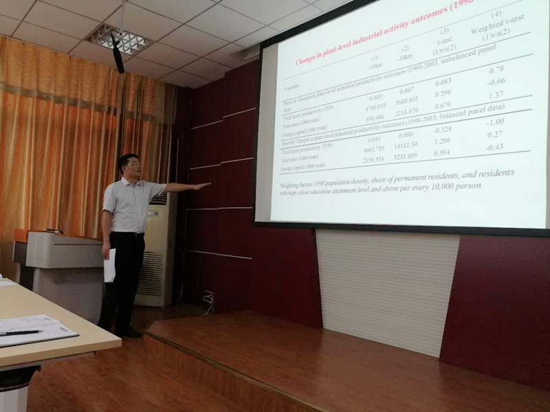 报告会中,王兵教授以三峡大坝周边环境、选取经济模型、数据对比分析、稳健性测试四个方面来阐述三峡大坝对工业企业生产力影响。最后,王教授得出三峡大坝对库区一定范围内的工业生产企业生产率具有负面影响。会后,王兵教授和台下师生进行了互动交流,分享自己科研研究宝贵经验。