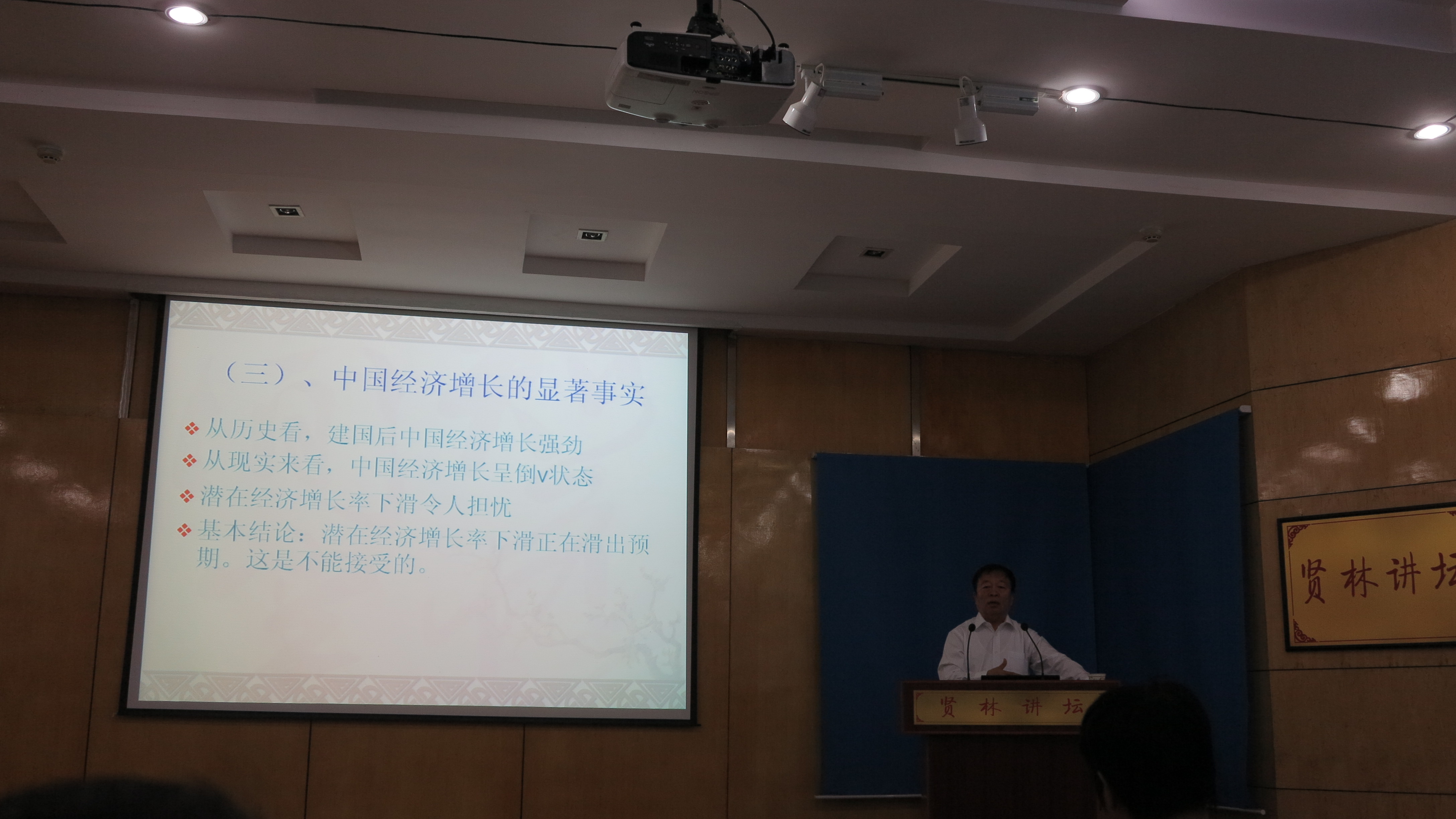 胡家勇研究员从中国经济增速换挡、潜在经济增长率、保持中高速增长的基本因素、新经济增长点四个方面阐释了中国经济新常态的现实状况、动力与结构等问题。其中,重点谈了中国经济保持中高速增长的基本因素。胡研究员的报告高屋建瓴,资料详实,视角独到,思维缜密,对深刻分析、把握当前中国经济现实有很强的指导意义,赢得了全场师生的热烈掌声。