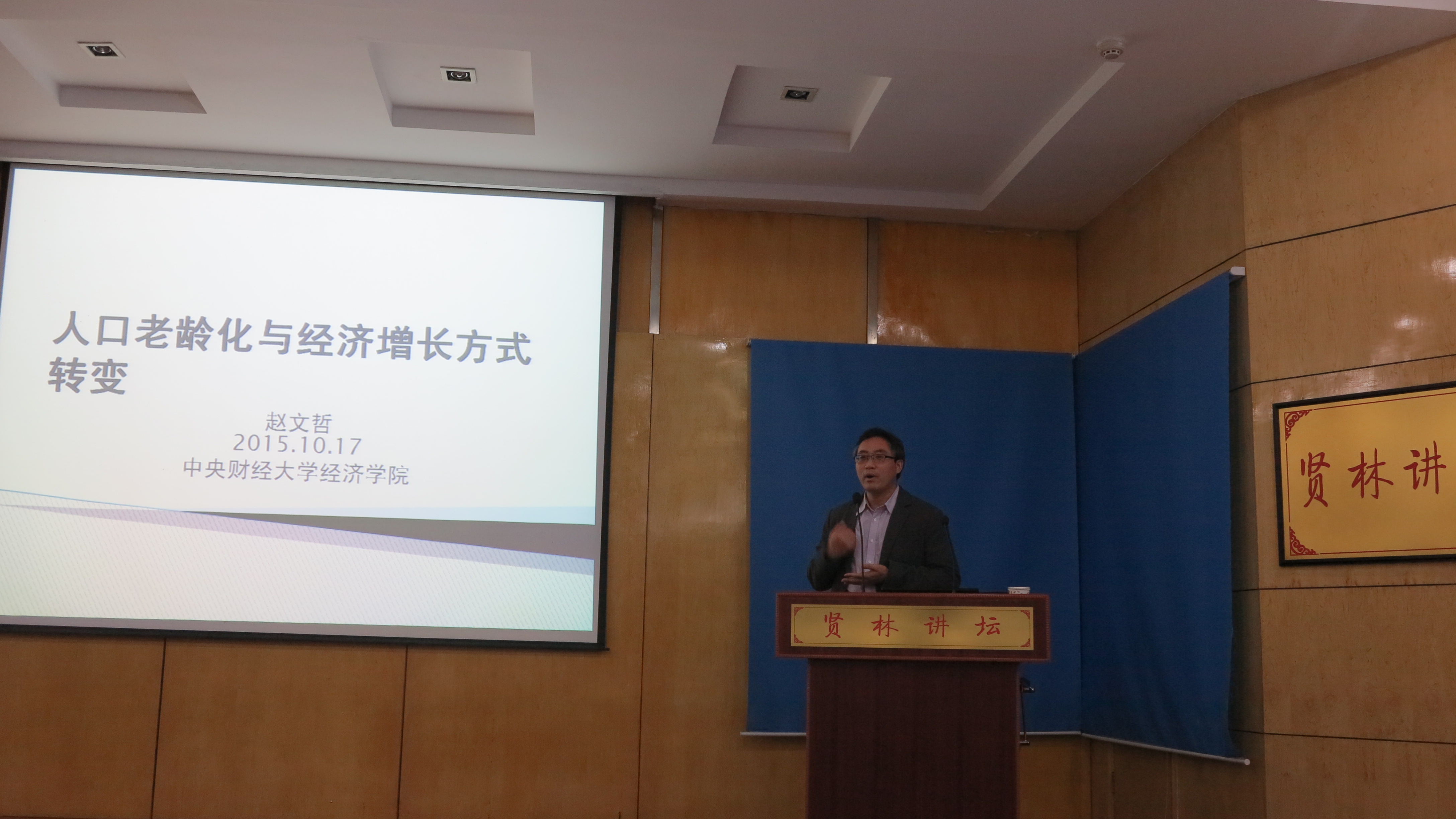 10月17日下午,应经济学院邀请,我校优秀校友、中央财经大学赵文哲博士在贤林讲坛作了一场题为“人口老龄化与经济增长方式转变”的报告。副校长齐城与经济学院师生共同参加了报告会,报告会由杜辉博士主持。