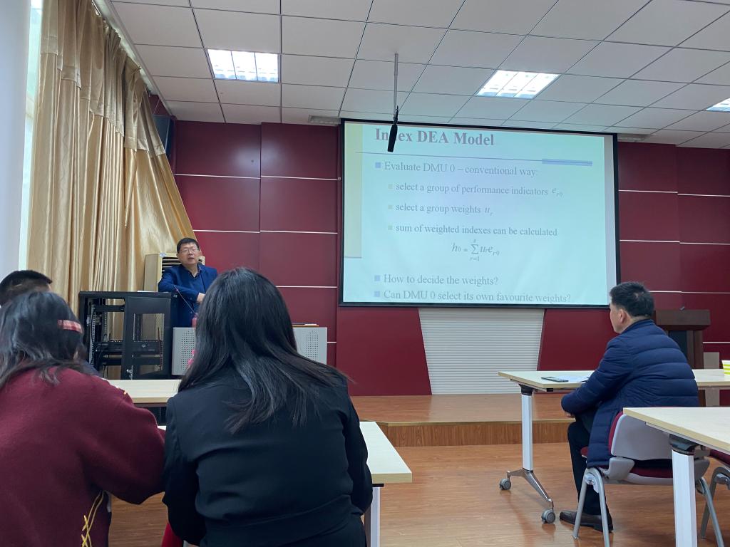 刘文斌教授首先介绍几种投资组合优化模型,然后通过生动具体的例子向师生解释DEA模型下BCC模型的适用范围:在无须假设权重的情境下,以各决策单位输入输出的存在关系的权重作为变量来评价指标。最后,刘文斌教授介绍了应用DEA最优模型对投资绩效进行评价的方法。