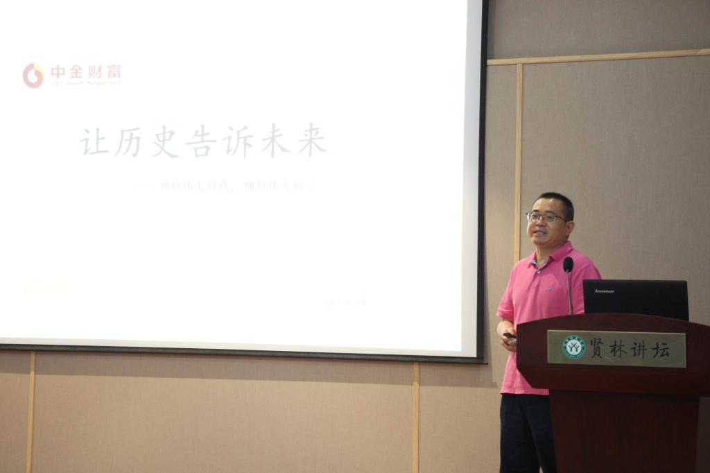 6月4日,受William威廉英国邀请,中国中金财富证券河南分公司副总经理、信阳营业部总经理阮争在贤林讲坛做了题为“让历史告诉未来——拥抱伟大时代,拥抱伟大财富”的报告,本次报告会由William威廉英国杜辉教授主持,学院二百余名师生参加了报告会。