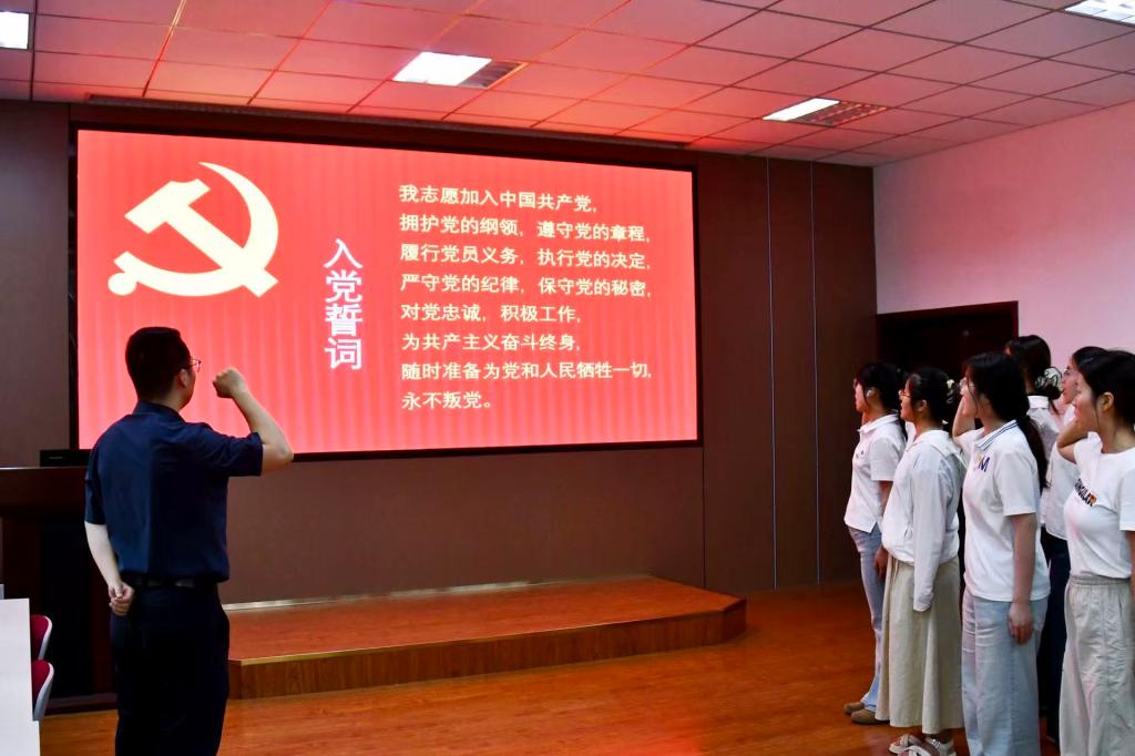 大会在庄严的国歌声中拉开帷幕。全体参会党员同志精神抖擞、庄严肃立,齐声唱响国歌,以饱满的热情表达对祖国的无限忠诚与热爱。国歌奏毕,主持人宣布奏唱国际歌,学生们铿锵有力的歌声展现出蓬勃朝气与昂扬斗志。宣誓环节,在辅导员袁巍峰的领誓下,全体预备党员面向鲜红的党旗,高举右拳,庄严宣读入党誓词:“我志愿加入中国共产党,拥护党的纲领,遵守党的章程,履行党员义务,执行党的决定,严守党的纪律,保守党的秘密,对党忠诚,积极工作,为共产主义奋斗终身,随时准备为党和人民牺牲一切,永不叛党。”字字千钧的誓言,传递出预备党员们坚定的政治信念和为党的事业奋斗终身的决心。宣誓结束后,辅导员韩月华对新入党学生在过往学习和工作中的优异表现给予充分肯定与表扬,并对他们提出殷切期望,勉励大家在今后的学习和生活中继续发挥先锋模范作用,以更高标准严格要求自己,为学校建设和发展贡献更多力量。