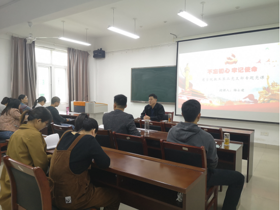 学院党委书记盛正国以“始终牢记党的初心使命,全面落实立德树人根本任务”为题,在经管楼310会议室为全体教工党员做了一场内容丰富的党课辅导报告。盛正国分别从初心和使命是中国共产党人的革命本色和根本动力,为党育人、为国育才是教育工作者的神圣使命,以及守土有责、久久为公,全面落实立德树人根本任务三个方面深入浅出的阐述了党员同志应如何守初心、担使命。他讲到,作为一名共产党员,应从坚持政治统领、加强理论武装、注重价值引领、做好言传身教等方面严格要求自己。