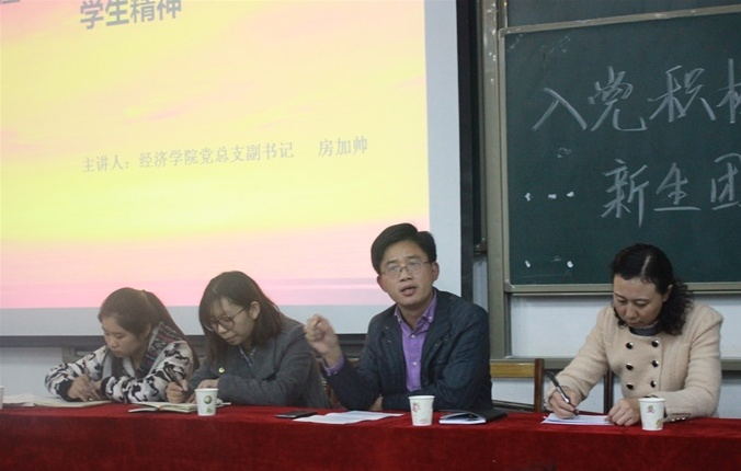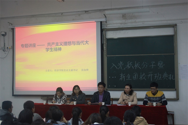 典礼结束后,经济学院党委副书记房加帅以《共产主义理想与当代大学生精神》为题作了首次专题讲座。房书记以活泼开放的形式、生动幽默的比喻带动了现场气氛,声情并茂地为同学们讲了中国共产党的历史、地位以及重要性。他要求同学们要严格树立起批判精神、执行精神、竞争精神、创新精神、自由精神、生命精神这六种精神。
