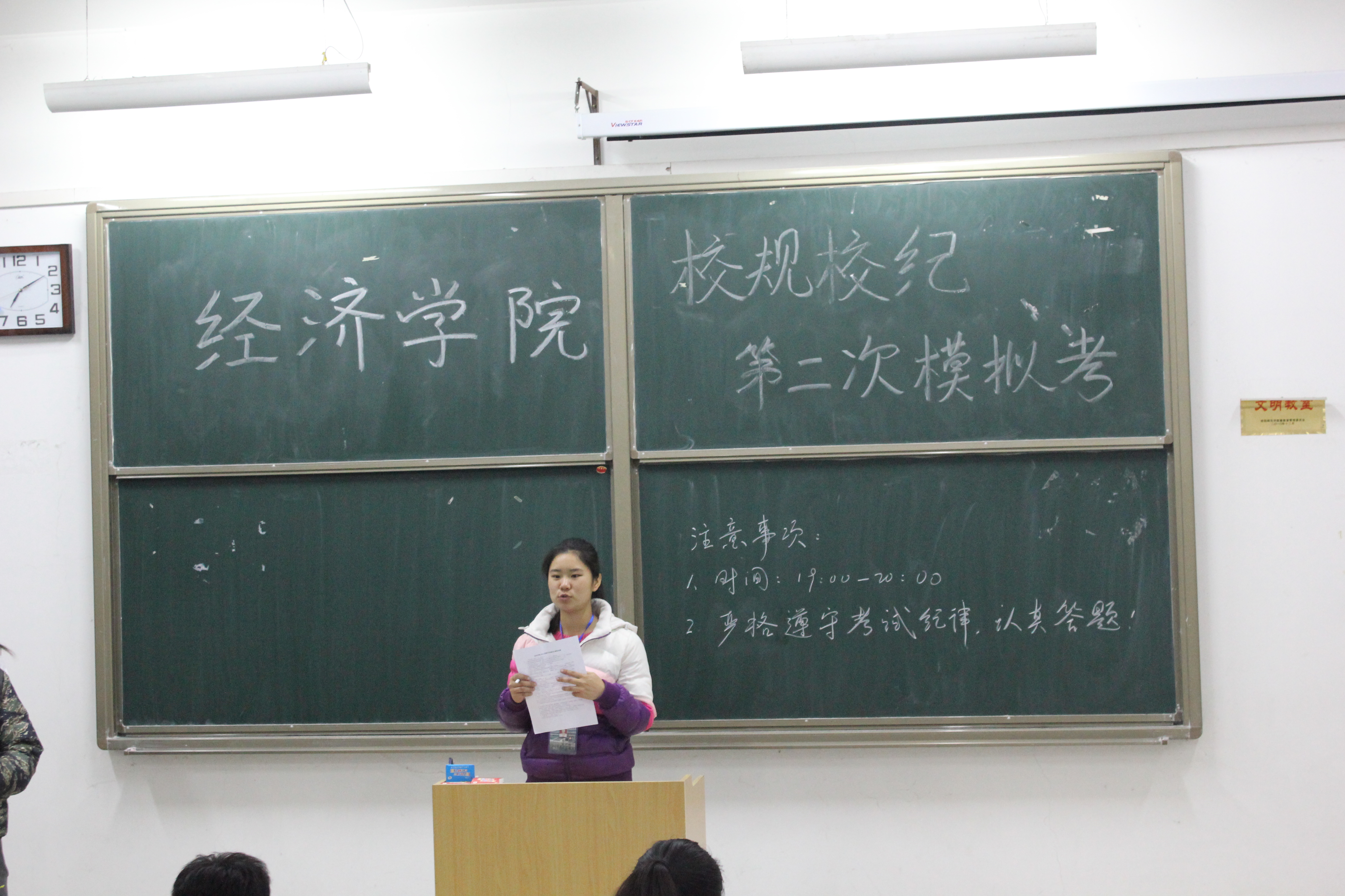 为迎接下周9号即将举行的校级新生校规校纪考试,12月5日晚,我院在经管楼101教室举行第二次校规校纪模拟考试。本次模拟考试主要是检验被抽考同学近期对校规校纪的复习情况,同时督促同学们积极备战大院考试。