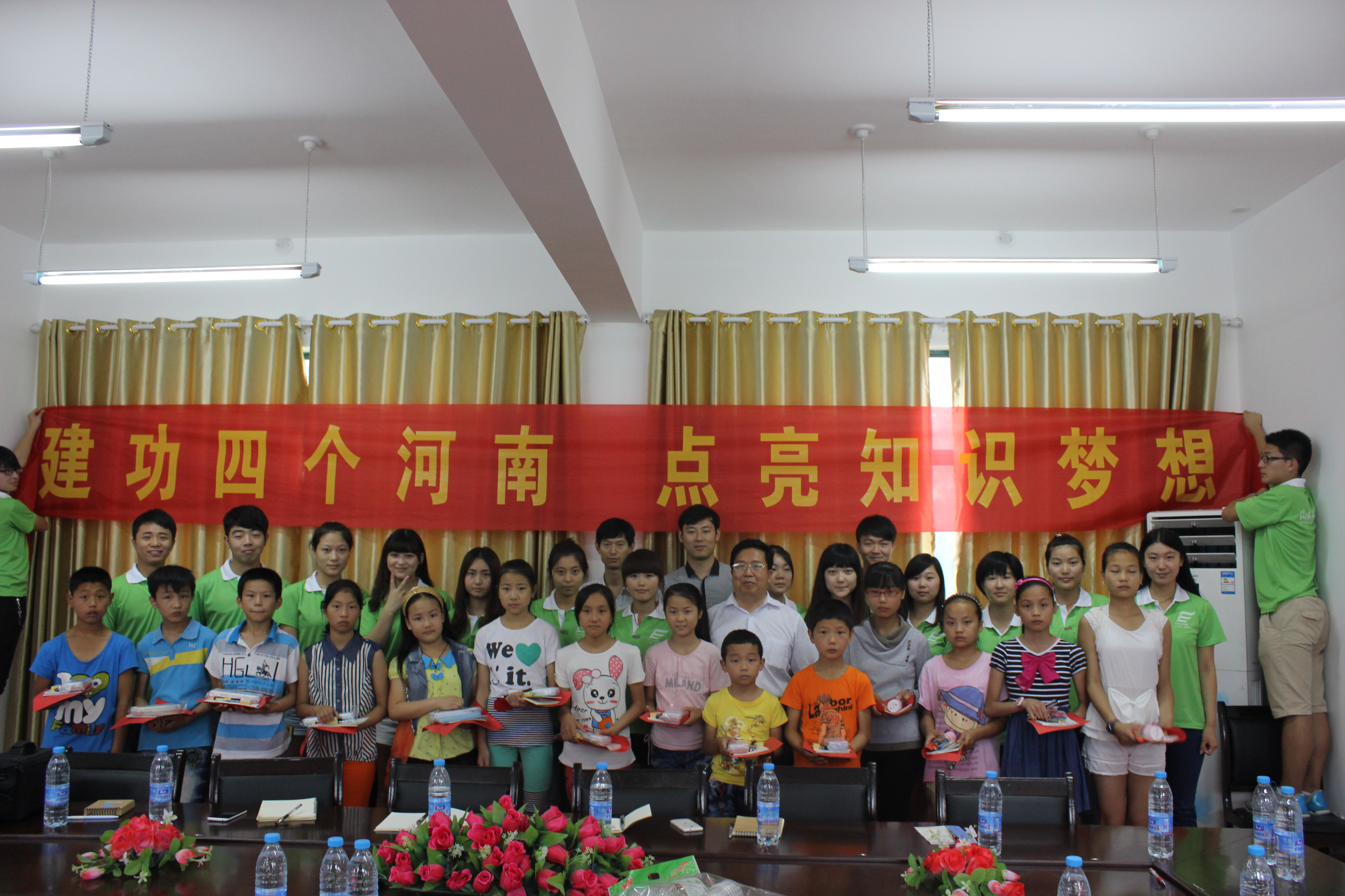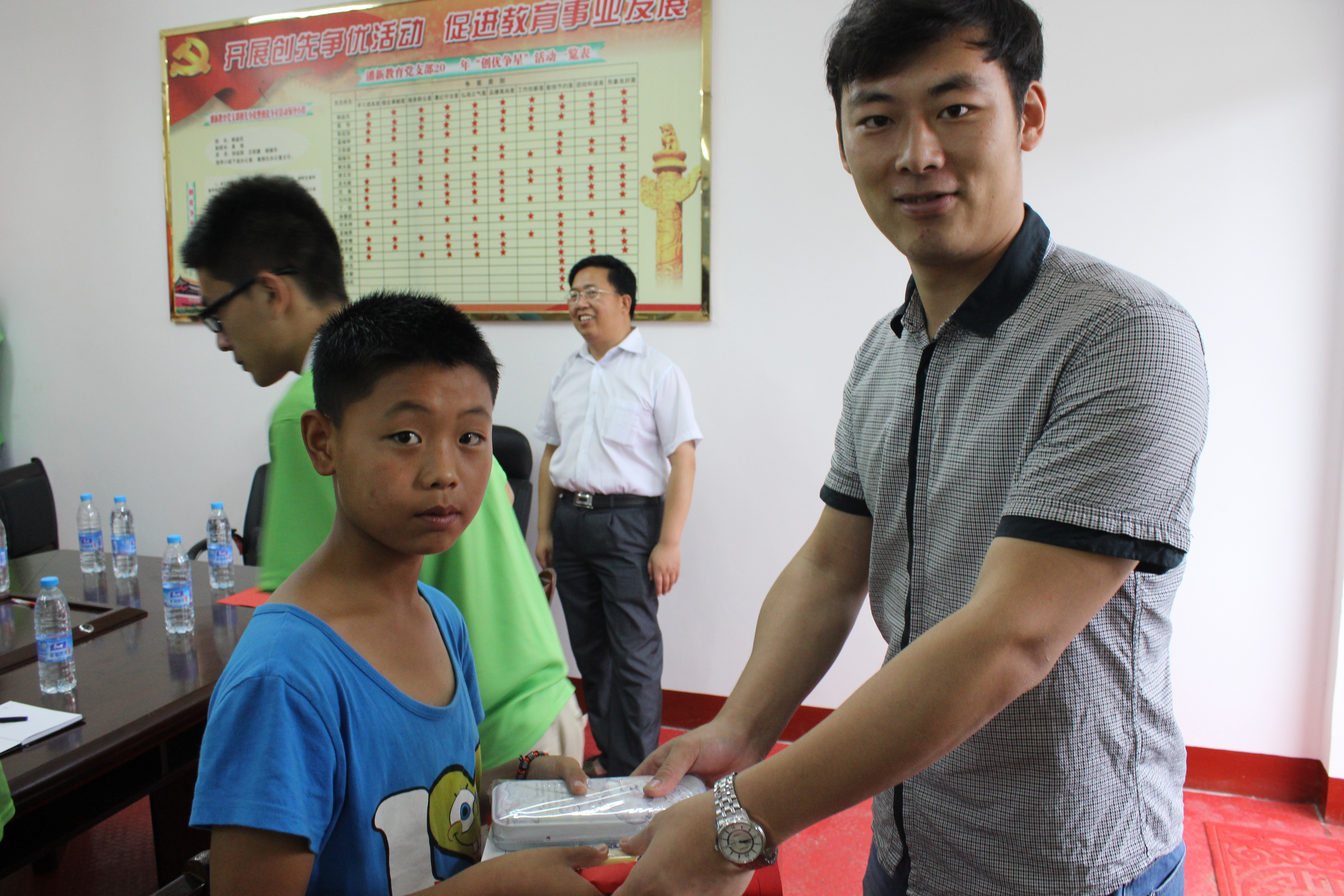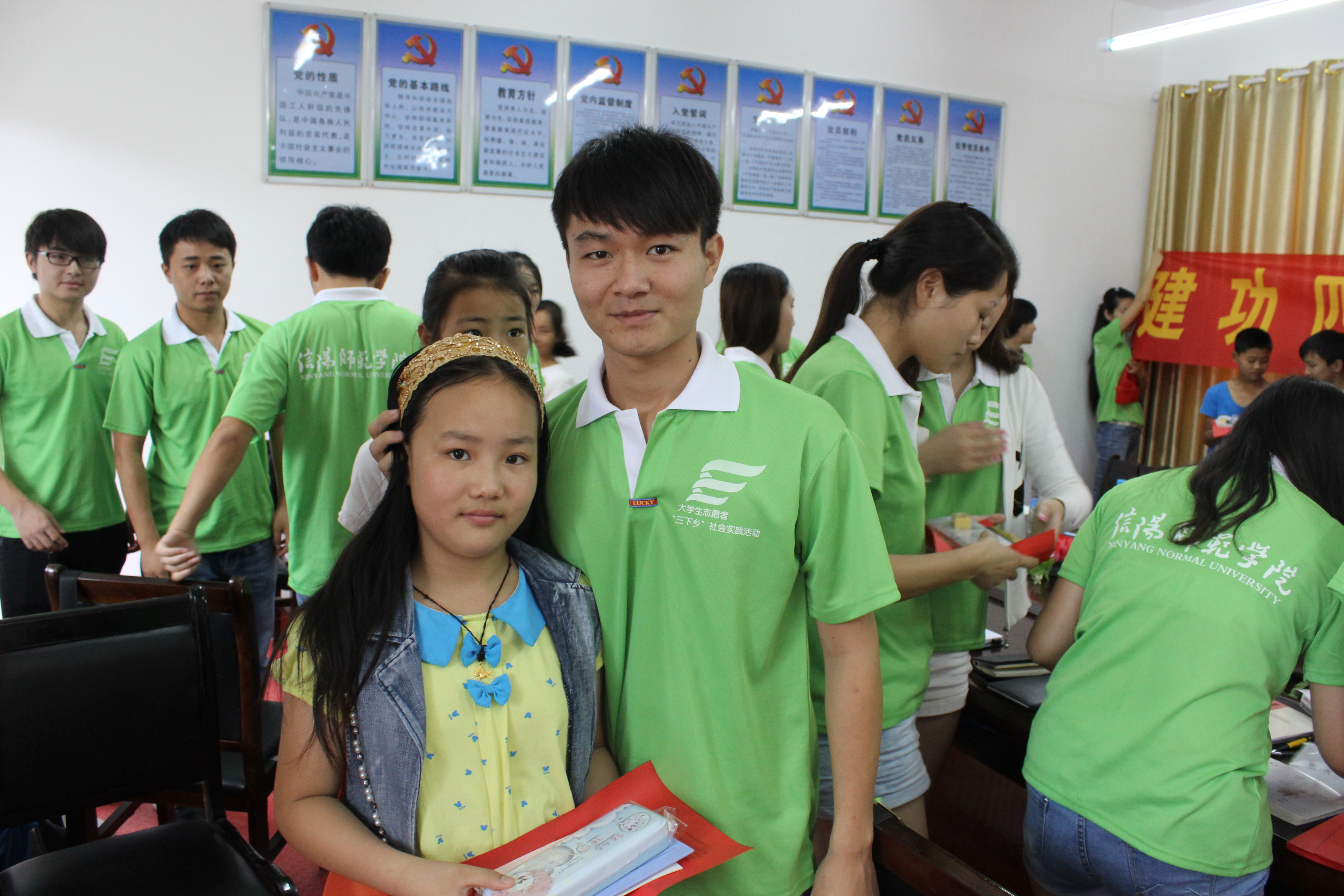 1号上午同学们冒着绵绵细雨参观了潘新中心学校,在会议室中首先陈老师表示这次社会实践活动是贯彻建功“四个河南”精神的一次亲近群众的活动,对郭校长的大力支持表示感谢。随后郭校长也对同学们的到来表示热烈欢迎,他就学校目前的师资力量作了简要介绍,并对在场同学们寄予希望,希望大家来这支教,共同为学生的学习成长提供帮助。接下来同学们将已准备好的文具分发给了学校中留守儿童,并勉励他们好好学习,立志成为祖国的栋梁之才。孩子们对收到文具表示感谢,也表示要立志学习,不辜负在外家长、老师和哥哥姐姐们的期望。