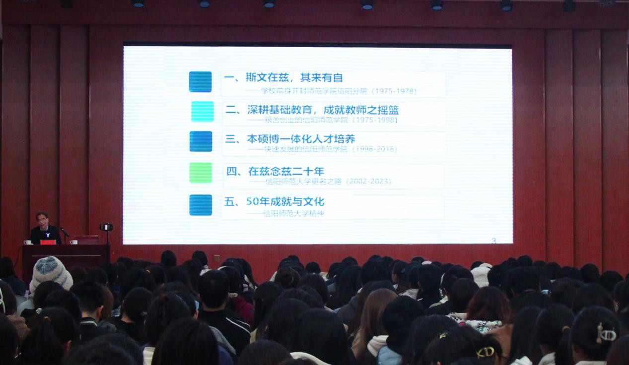 尹全海教授以“清华四导师”之一王国维的故事为切入点,点明作为学生了解学校历史的必要性,紧接着从发展史、基础教育、学科建设、更名过程和师大精神等五个方面进行校情讲解,帮助同学们了解学校的奋斗历史,体会到更名的艰难与不易。最后,尹全海表达了对学校发展的殷切期望和美好憧憬,他希望全体同学能够秉承“厚德崇实 善学敏行”的校训,砥砺奋斗、不负韶华。