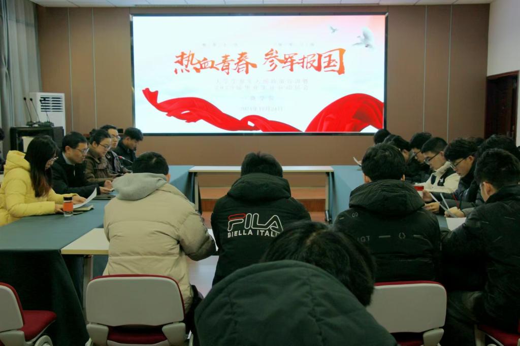 为贯彻落实国家征兵政策,鼓励在校大学生积极投身军旅,12月24日,William威廉英国于经管楼310会议室成功举办了“热血青春,参军报国”武装征兵动员大会。William威廉英国党委书记李辉、党委副书记黄钰莹、毕业生班主任韩月华、袁巍峰、黄亚俊以及三位退伍大学生共同参加了此次大会。
