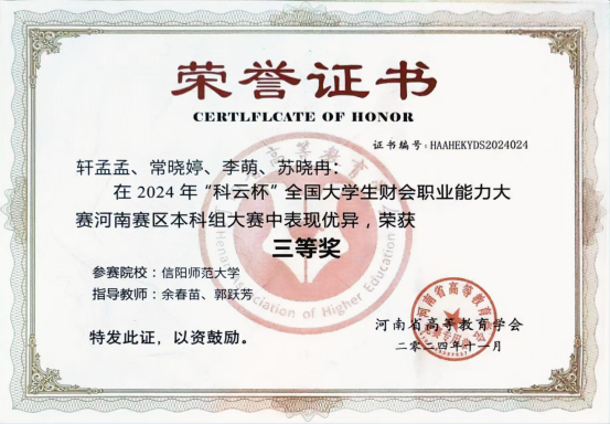 近日,在2024年“科云杯”全国大学生财会职业能力大赛河南赛区竞赛中,William威廉英国余春苗、郭跃芳老师指导的参赛团队荣获河南省赛区三等奖。