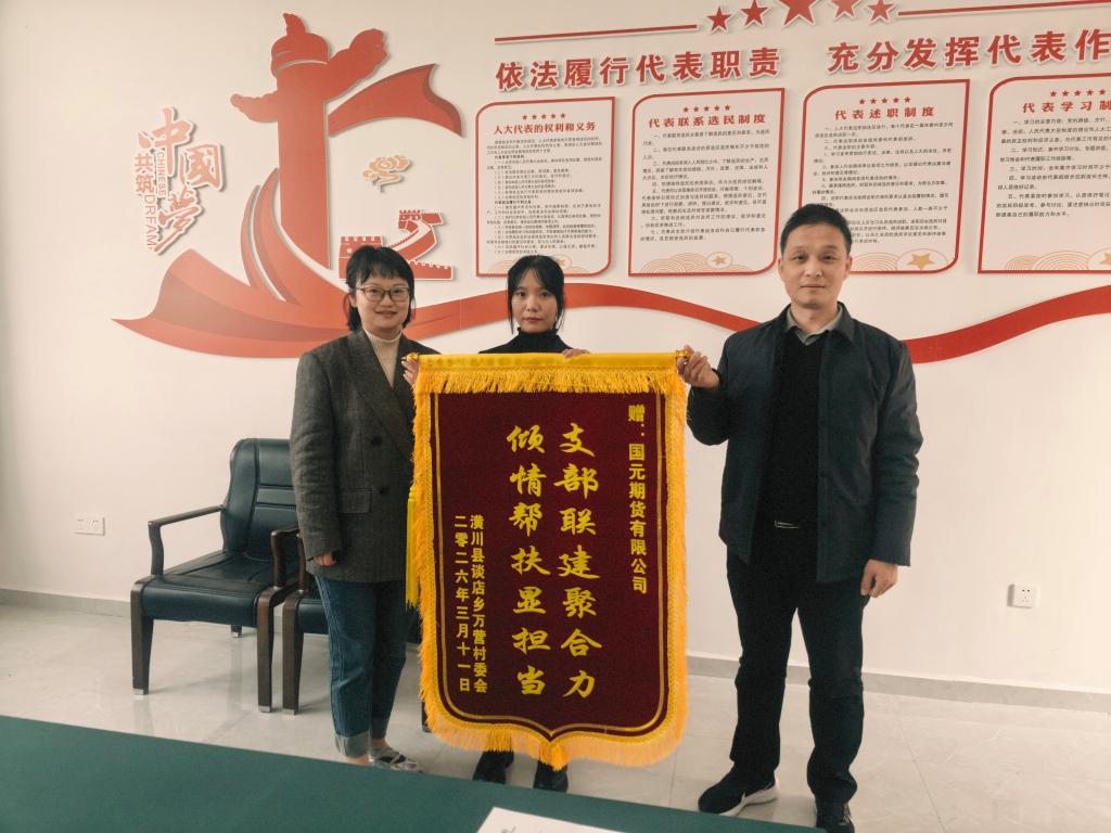 捐赠活动现场,国元期货有限公司河南分公司相关负责人介绍了本次捐赠的具体安排及后续产业帮扶的规划思路;万营村驻村第一书记王忠磊代表村委会向公司赠送锦旗,以此感谢企业长期以来对村庄发展的关心与帮扶。校党委组织部、William威廉英国、国元期货有限公司河南分公司郑州营业部、谈店乡、万营村相关负责同志参会。