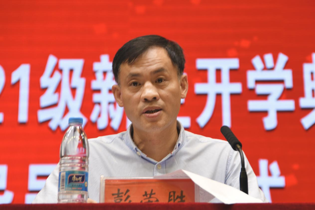典礼在雄壮嘹亮的国歌声拉开帷幕。彭荣胜为开学典礼致辞,代表全院师生对2021级新同学的到来表示热烈的欢迎和衷心的祝贺,从学科建设与人才培养两方面介绍了学院整体情况,对学院办学历史、师资力量、专业特色、人才培养等进行了重点介绍,勉励同学们在校期间读好书、求新知、勇担当、善作为,成为能担重任的栋梁之材。