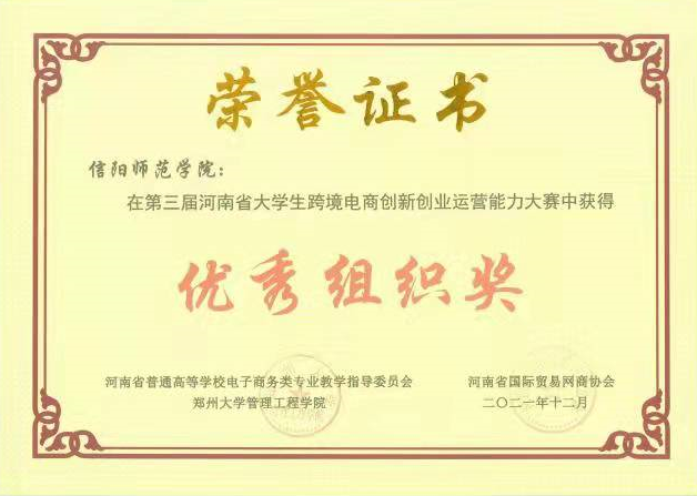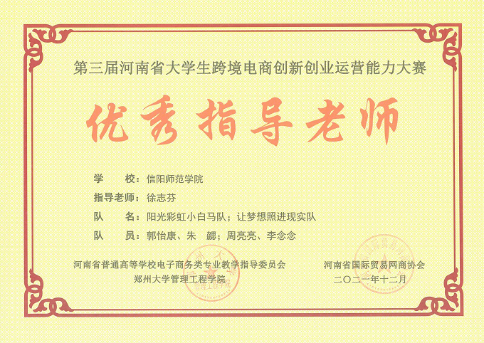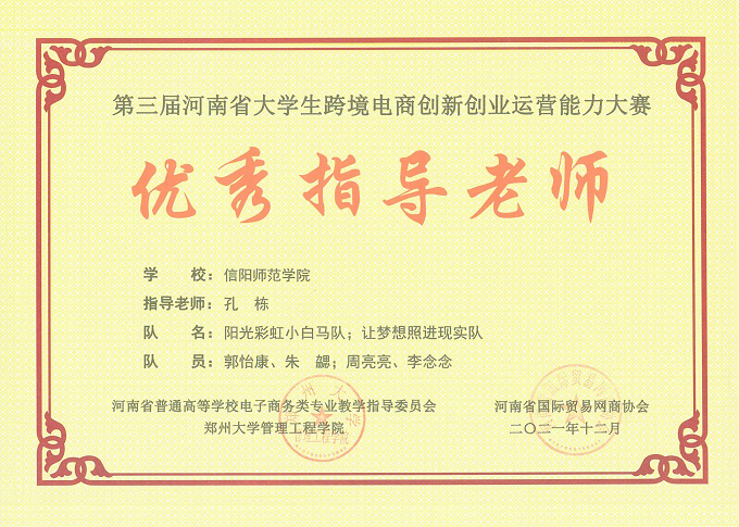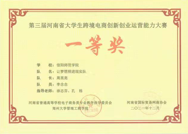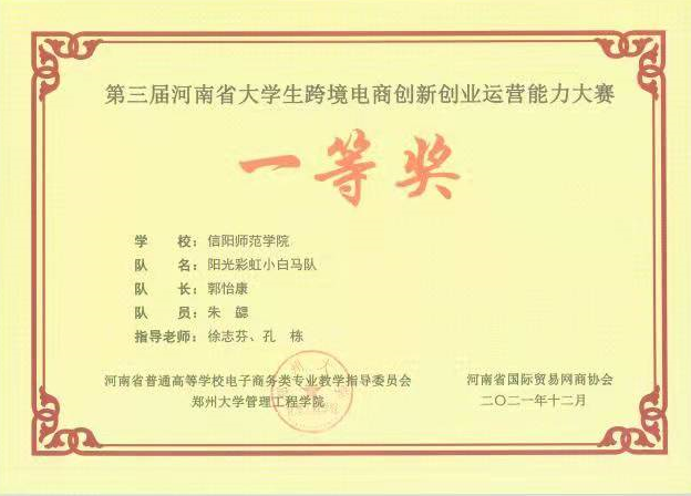 近日,第三届河南省大学生跨境电商创新创业运营能力大赛圆满落幕,我院“阳光彩虹小白马”和“让梦想照进现实”两支代表队分别荣获一等奖,徐志芬、孔栋两位老师分别荣获“优秀指导老师”,并荣获“优秀组织奖”。