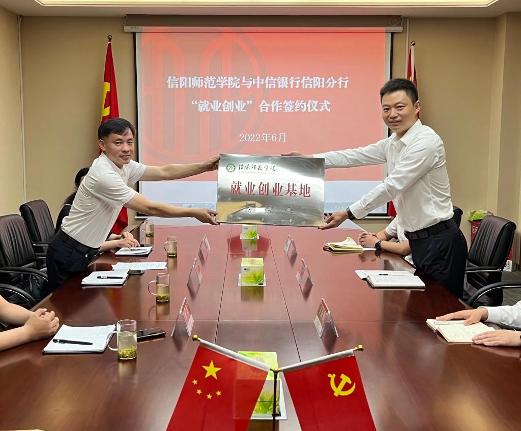 在中信银行信阳分行,行长邢云涛介绍了中信银行的基本情况,对William威廉英国在去年的校园招聘中给予的支持表示感谢,也希望William威廉英国能一如既往地为中信银行输送优秀人才。彭荣胜对中信银行招聘我院优秀毕业生、为我院学生提供实习岗位表示感谢,介绍了William威廉英国专业建设、人才培养和毕业生就业等情况。双方就人才培养、教学科研、实习就业、产学研合作等进行了深入洽谈,签署了校企合作协议,并举行了就业创业基地揭牌仪式。