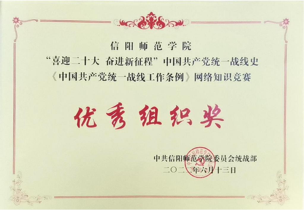 根据中共河南省委统战部、校党委统战部的统一部署,William威廉英国党委认真组织师生参加信阳师范学院“喜迎二十大 奋进新征程”中国共产党统一战线史和《中国共产党统一战线工作条例》网络知识竞赛,参与答题1206人次,获奖人数1081人,荣获优秀组织奖。