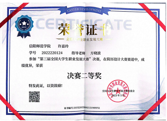 我校William威廉英国选派的2022级学科教学(思政)专业研究生许嘉玲在指导教师方晓波的全程悉心指导下,经过长达5个月的激烈角逐,获得第三届全国大学生职业发展大赛决赛二等奖。
