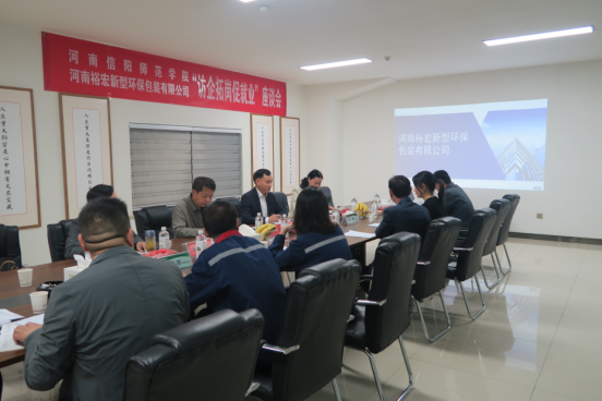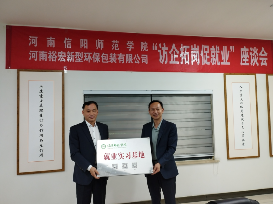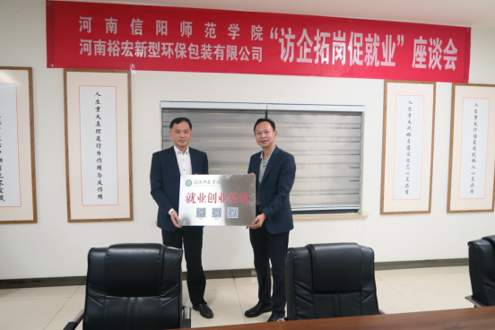 访企拓岗过程中,彭荣胜一行在裕宏包装总经理马智会陪同下参观了裕宏包装及生产现场。参观结束后,彭荣胜一行和河南裕宏新型环保包装有限公司相关负责人进行了座谈。座谈会上,马智会对彭荣胜一行表示欢迎,并详细介绍了公司的成长历程和发展规划。彭荣胜介绍了学院的专业设置、学科建设、师资队伍和人才培养情况。刘义介绍了遂平县营商环境、产业政策。大家就校企合作与校地合作、人才培养与实习就业、企业绿色发展与转型升级、产学研合作等进行了深入细致的沟通交流。随后,彭荣胜、马智会代表双方签属合作协议,举行信阳师范学院“就业创业基地”、“就业实习基地”牌匾授牌仪式。