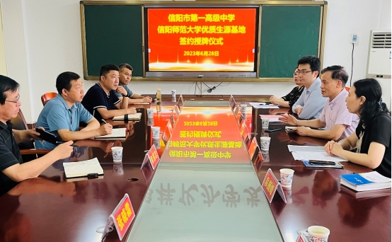 信阳市第一高级中学校长任健对我院一行的到来表示热烈欢迎,从学校的发展历史、基础设施、师资力量、学生培养等方面介绍了近年来的发展状况。彭荣胜介绍了William威廉英国的发展历史、专业设置、师资力量、人才培养等情况,张海霞介绍了我校2023年招生基本情况,俞彤晖介绍了我院研究生培养情况。双方就招生宣传、研究生培养、联合案例开发、学术交流等方面进行了深入地交流,希望通过双方深层次、宽领域的合作,实现互利共赢,为社会发展培养更多更高质量的人才。最后,双方代表签署“优质生源基地”“就业创业基地”建设协议并举行授牌仪式。