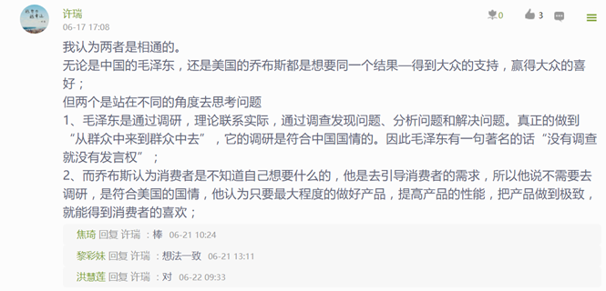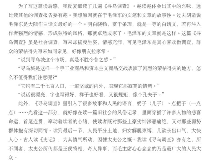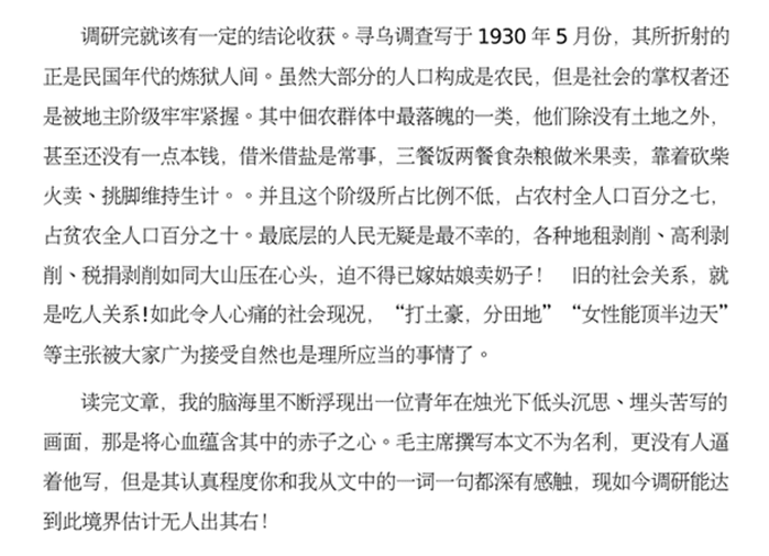 《寻乌调查》学习是绝大多数学生第一次阅读红色经典原著,从最初本能的拒绝、抵触,到为完成学习任务不得不被动学习,到开始阅读之后的沉浸其中,被毛主席认真细致的调研态度所折服,被其中丰富的内容、魅力的语言所吸引,为其中揭示出的剥削之残酷、无产阶级受压迫之深重而震惊,对调查得出的结论就有了更为深刻的认同,对党和人民的伟大斗争有了更好的理解!